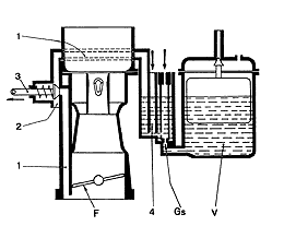 FIG. 13 Starter simple - canal de mélange de starter - 2 jet d'air de starter - 3 soupape de starter - 4 puisard de réserve de starter - F papillon - Gs gicleur de starter - V cuve. |