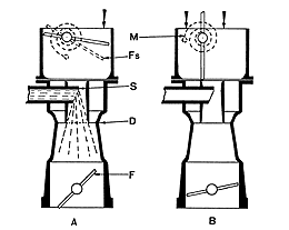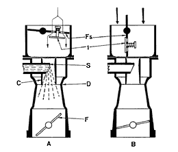FIG. 16 Starter à volet excentrique avec soupape - 1 soupape de dégorgement - Fs volet de starter - S gicleur - C centreur - D diffuseur - F papillon primaire - En A starter en action, en B starter exclu. |