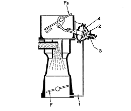 FIG. 15 Dégorgement pneumatique - 1 gicleur de calibrage sur le conduit de dépression - 2 ressort de rappel membrane - 3 vis de réglage - 4 membrane -Fs volet de starter F papillon primaire. |