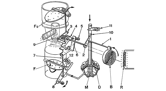 FIG. 17 Schéma de starter automatique - 1 axe, 2 levier, 3 levier, solidaires entre eux - 4 came de ralenti accéléré - 5 vis de réglage de ralenti accéléré - 6 levier de ralenti accéléré - 7 tirant - 8 levier d'accélérateur - 9 ressort reliant la came 4 au levier 3 - 10 tige de l'appauvrisseur pneumatique - 12 régulateur de régime de ralenti - Fs volet de starter - F papillon primaire - M ressort antagoniste de la membrane D - B ressort à spirale bimétal - R réchauffeur bimétal B |