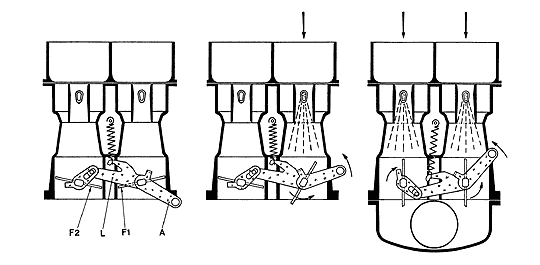 FIG. 18 Ouverture différentielle mécanique des papillons - A levier d'accélérateur solidaire du papillon primaire F1 - L levier libre commandant le papillon secondaire F2. |
