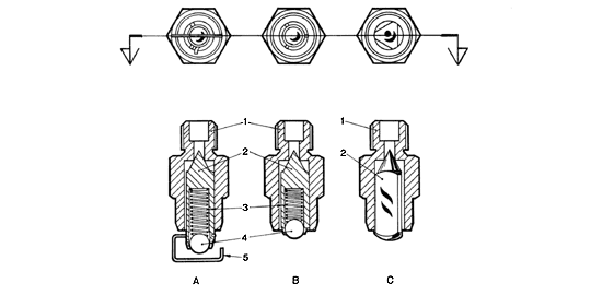 | FIG. 25 Amortisseur de pointeau d'aspiration essence - 1 logement du pointeau 2 - 3 ressort - 4 bille - 5 crochet d'actionnement du pointeau. |