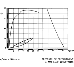 FIG. 27 Courbe des prestations d'une pompe mécanique - à gauche, en haut débit de la pompe à refoulement libre; en bas C. consommation du moteur en puissance et en utilisation. A droite, allure de la pression de refoulement au changement du débit à 2000 t/min constants de la came. |