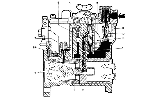 | FIG. 29 Vue en coupe d'un carburateur série DCOE 1 diffuseur - 2 centreur - 3 gicleur principal - 4 jet d'air principal - 5 tube d'émulsion - 6 gicleur de ralenti - 7 gicleur de pompe 11 soupape - 12 pointeau - 14 flotteur - 16 Vis de réglage mélange de ralenti - 17 papillon. |