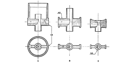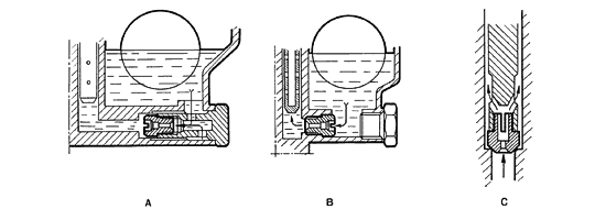 | FIG. 34 Gicleur principal de carburant - En A il est monté sur un porte-gicleur, en B il est vissé dans le corps du carburateur, en C il est coaxial au tube d'émulsion comme dans les carburateurs série DCOE. |