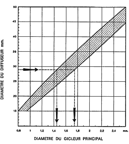 FIG. 35 Diagramme pour le choix du diamètre du gicleur principal de carburant suivant le diamètre du diffuseur, si l'on établit pour le jet d'air de freinage la valeur de 2,00 mm Moteurs à essence et à 4 temps. Dans le diagramme le diffuseur alimente 4 ou 6 cylindres. S'il alimente 2 cylindres multiplier par 0,90 le diamètre du jet trouvé, s'il alimente un cylindre (applications sportives) multiplier par 0,75 le diamètre du jet. Exemple : si un diffuseur de 29 mm alimente 4 ou 6 cylindres, il nécessite d'un gicleur principal de 1,45 à 1,75 mm de diamètre, s'il alimente un cylindre, le diamètre du gicleur se réduit à 1,10 ou à 1,30 mm. Ces valeurs sont uniquement indicatives et l'on conseille de commencer les essais avec le gicleur de plus grand diamètre, en le réduisant suivant les exigences. |